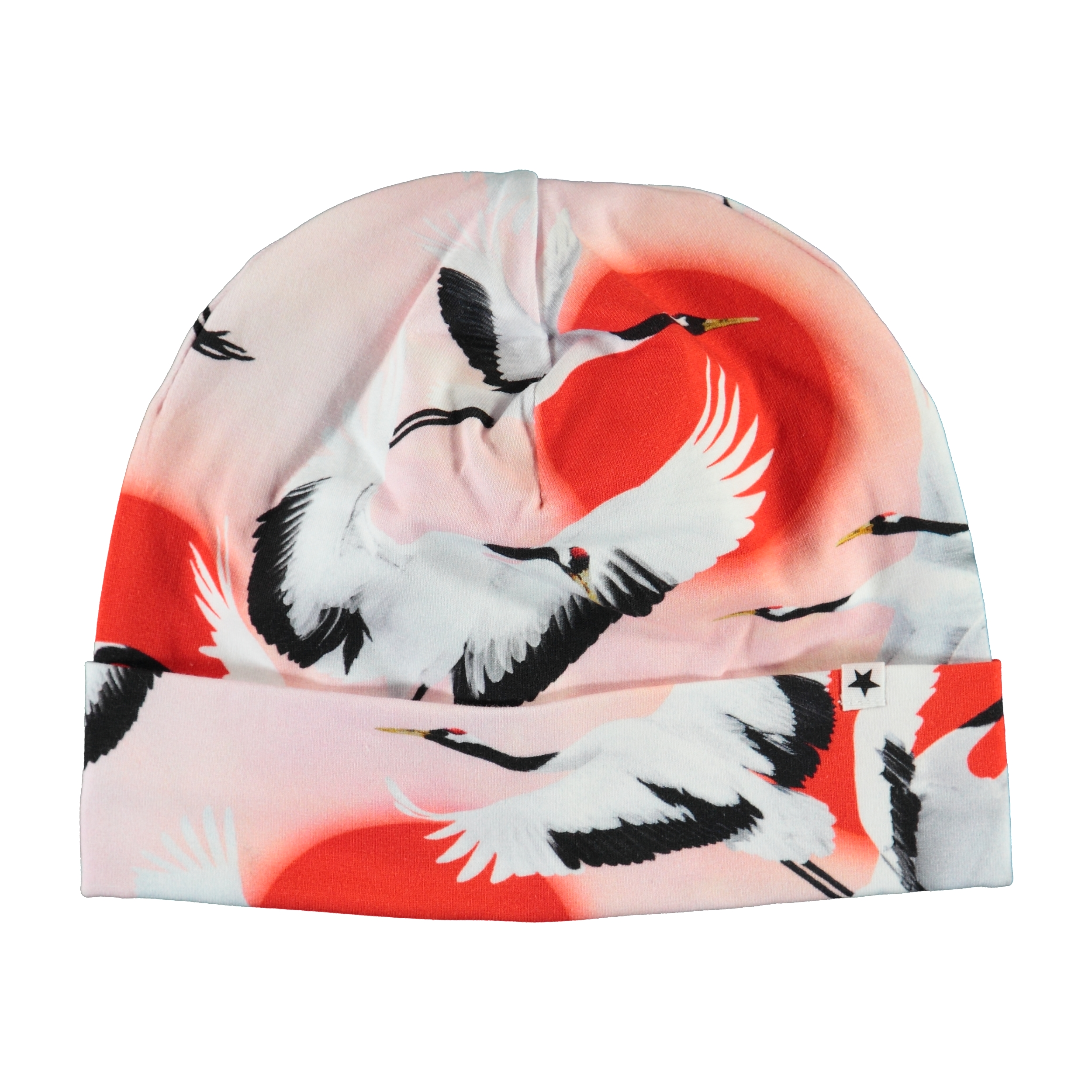 Blød og elastisk dobbeltlaget hue i lyserød med print af flyvende traner. Kan bruges med og uden ombuk.