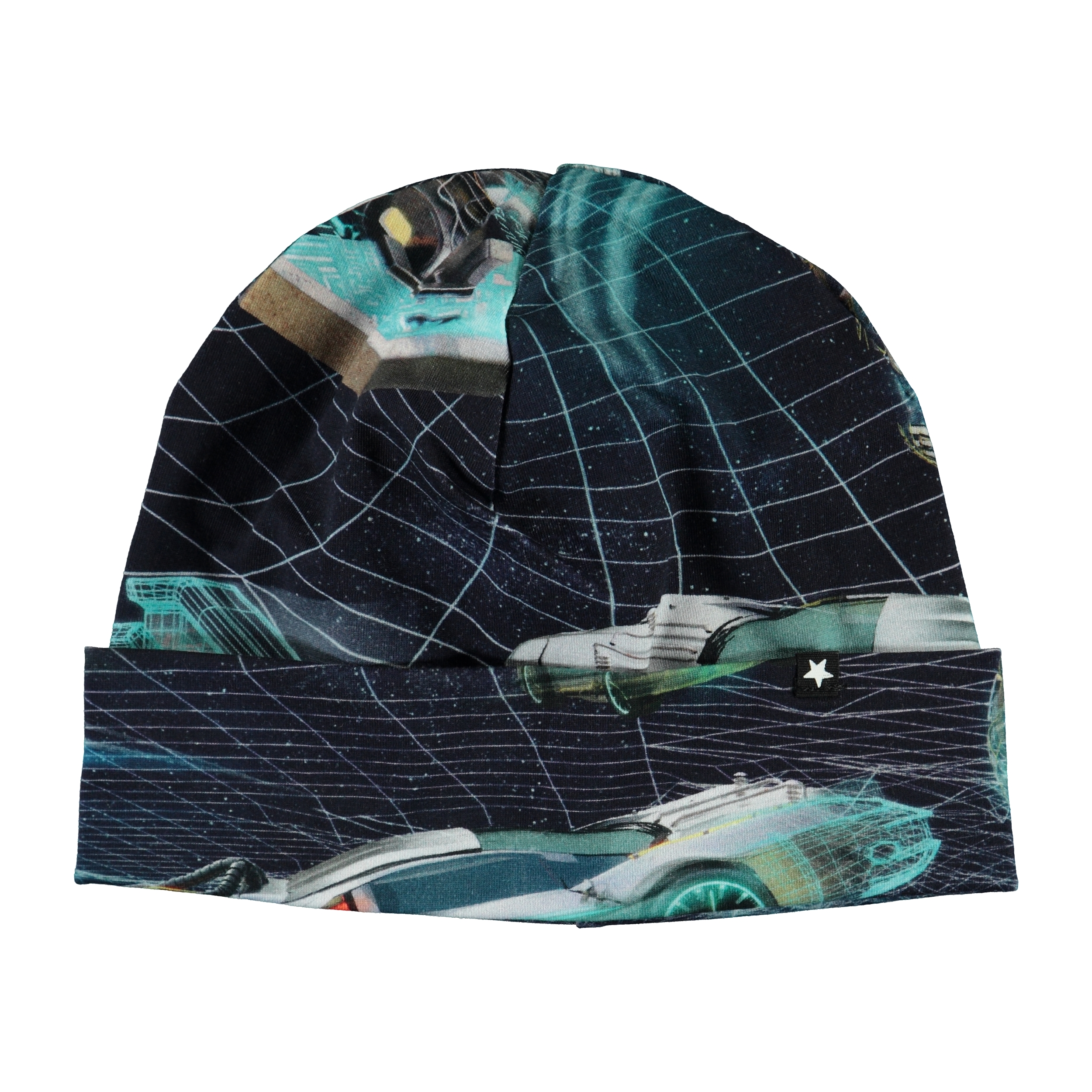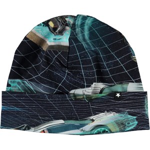Blød og elastisk dobbeltlaget hue med print af framtidens tidsmaskiner. Kan bruges med og uden ombuk.