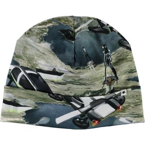 Blød og elastisk dobbeltlaget hue med af print af rumskibe. Huen kan bruges med og uden ombuk. Certificeret af Ecocert Greenlife, certifikationsnr. 197496.