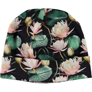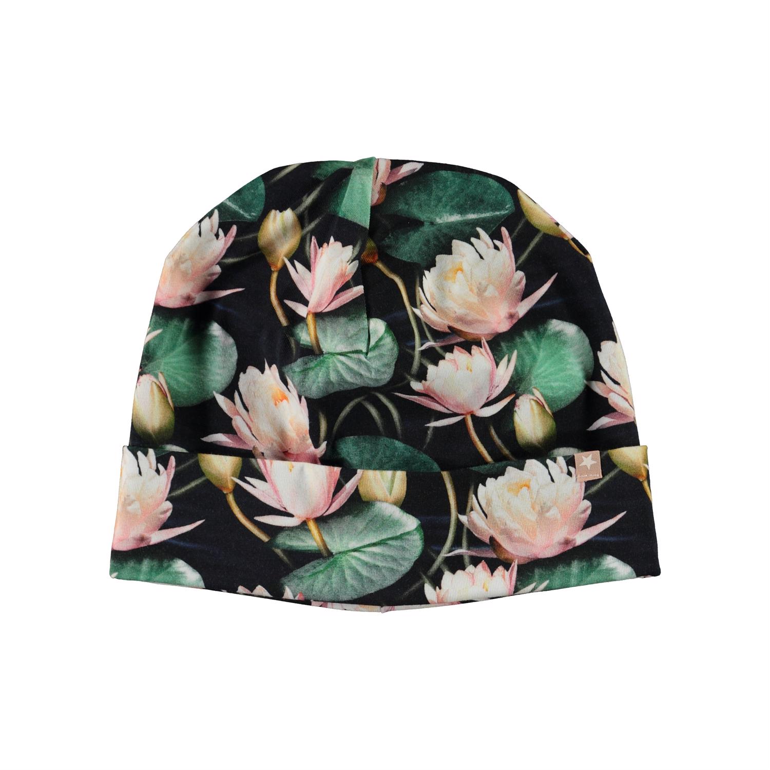 Blød og elastisk dobbeltlaget hue med print af lyserøde åkander. Huen kan bruges med og uden ombuk.