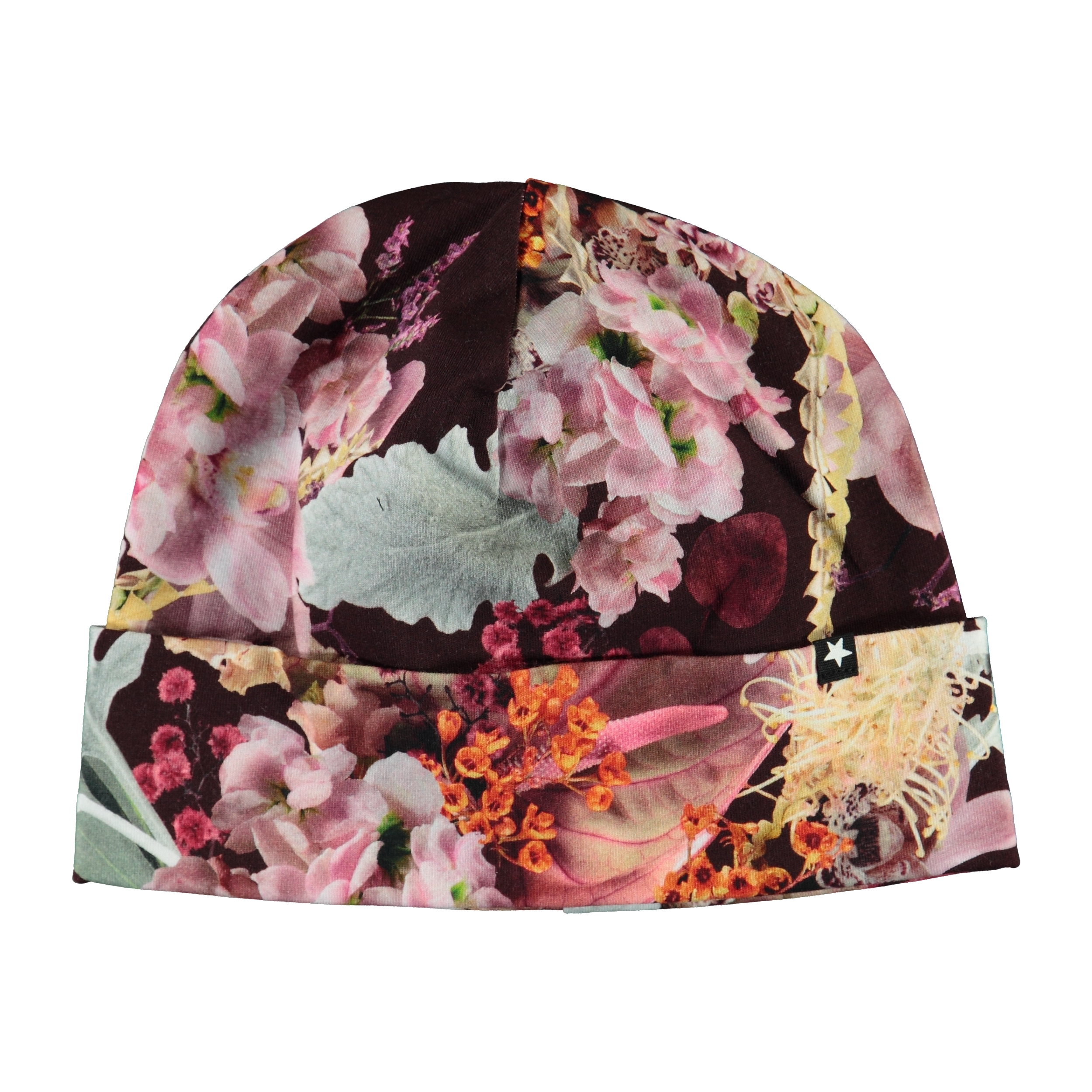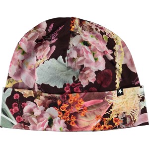 Blød og elastisk dobbeltlaget hue med print af blomster. Kan bruges med og uden ombuk.