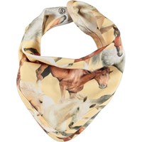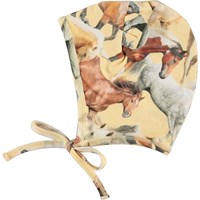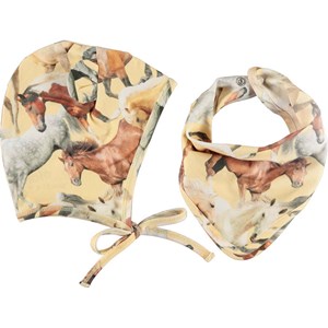 Lysegul babykyse og hagesmæk i hvid med print af smukke løbende heste. Kysen kan bindes tæt til ansigtet med snøre under hagen. Desuden har huen små påsyede ører. Hagesmækken lukkes med trykknap i nakken.