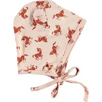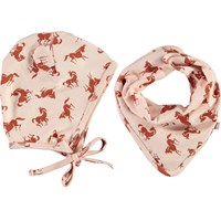Babyhue og hagesmæk i lyserød med print af små heste. Huen kan bindes tæt til ansigtet med snøre under hagen. Desuden har huen små påsyede ører. Hagesmækken lukkes med trykknap i nakken.
