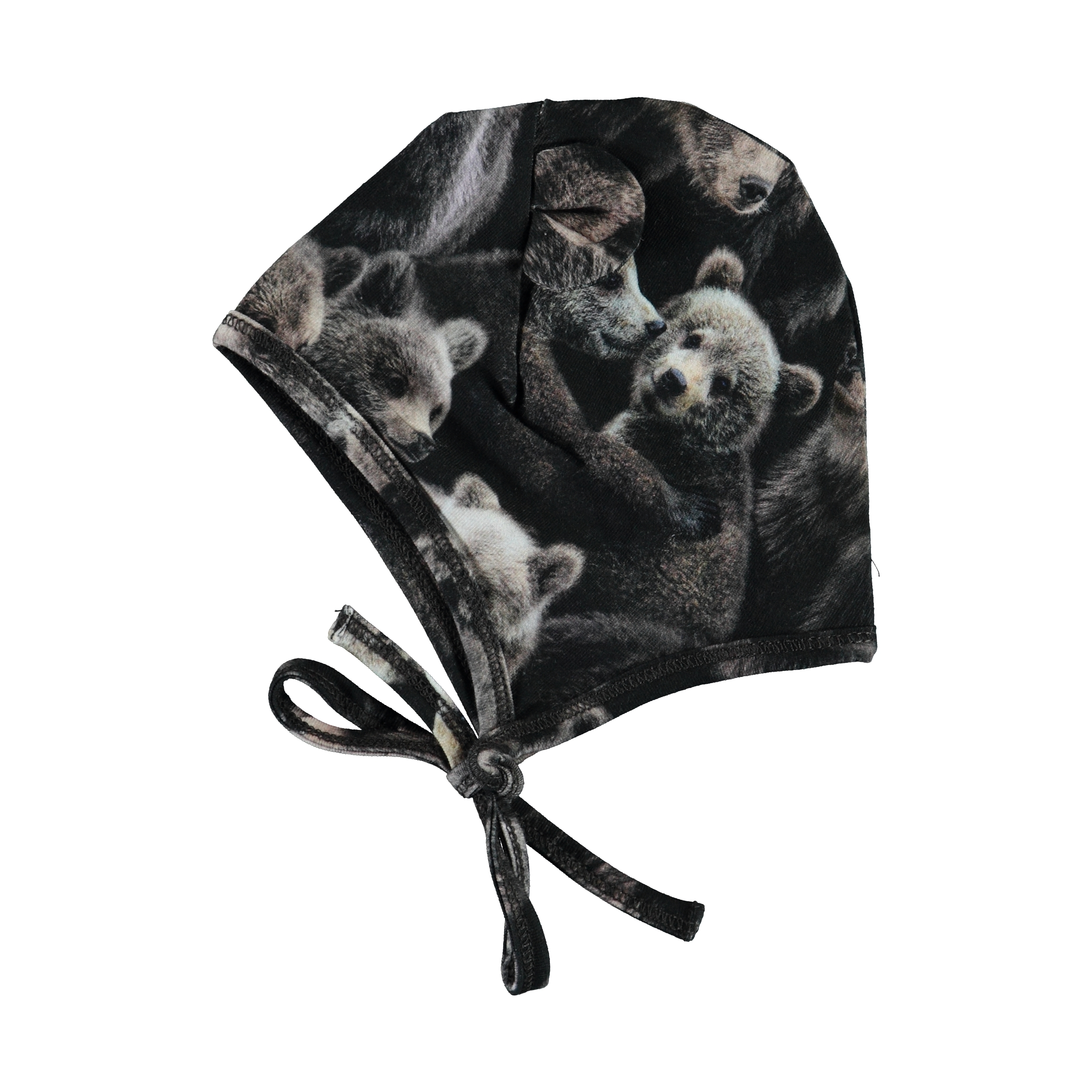 Babyhue med print af søde bjørne. Kan bindes tæt til ansigtet med snøre under hagen.