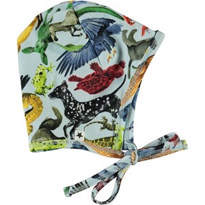 Lyseblå babyhue med print af forskellige dyr. Huen kan bindes tæt til ansigtet med snøre under hagen. Desuden har huen små påsyede ører. Certificeret af Ecocert Greenlife, certifikationsnr. 197496.