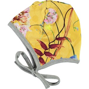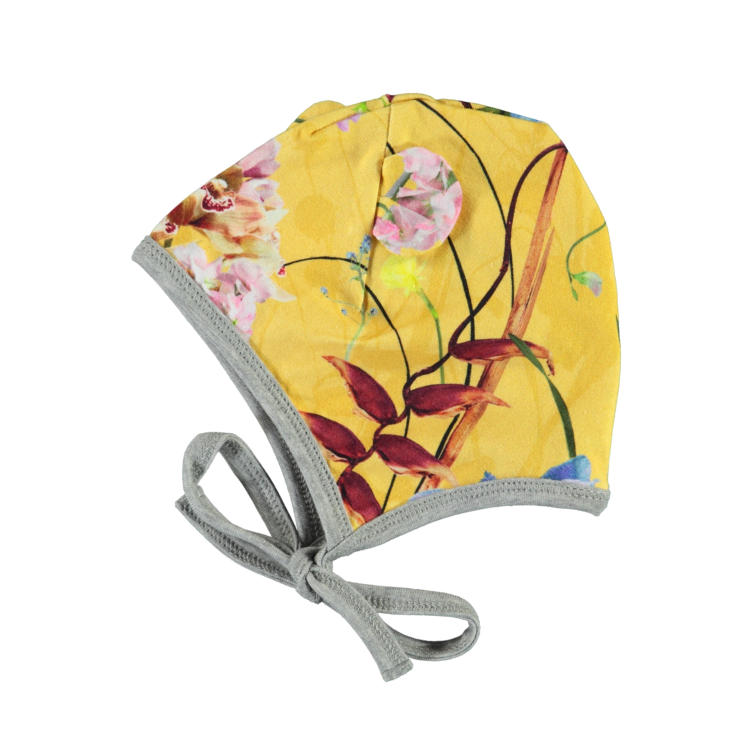 Babyhue i gul med blomster print. Kan bindes tæt til ansigtet med snøre under hagen.