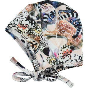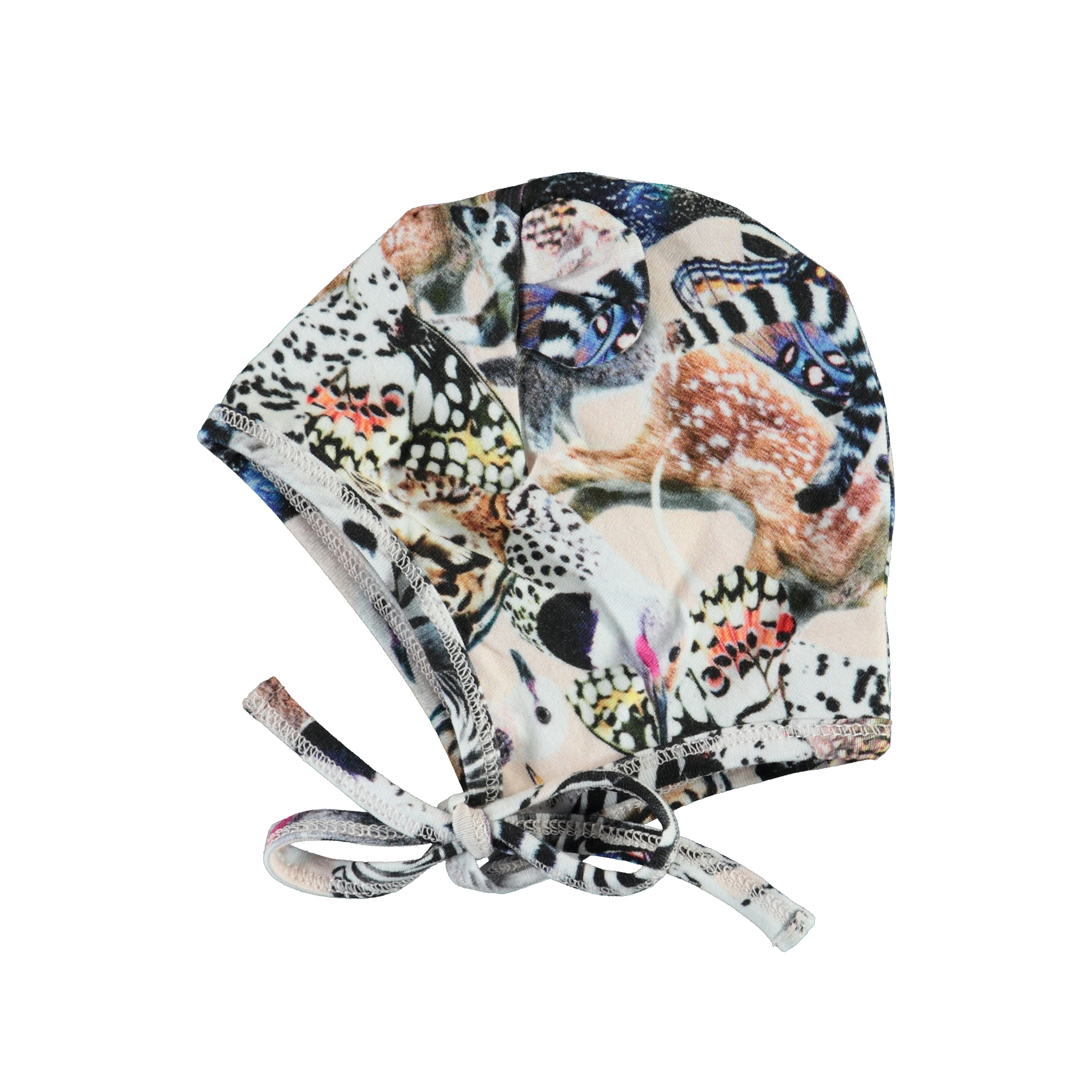 Babyhue med print af forskellige dyr, som danner et flot mønster. Kan bindes tæt til ansigtet med snøre under hagen.