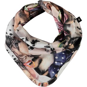 Hagesmæk med print af små hunde med sløjfer om halsen. Hagesmækken lukkes med trykknap i nakken.  Certificeret af Ecocert Greenlife, certifikationsnr. 197496.