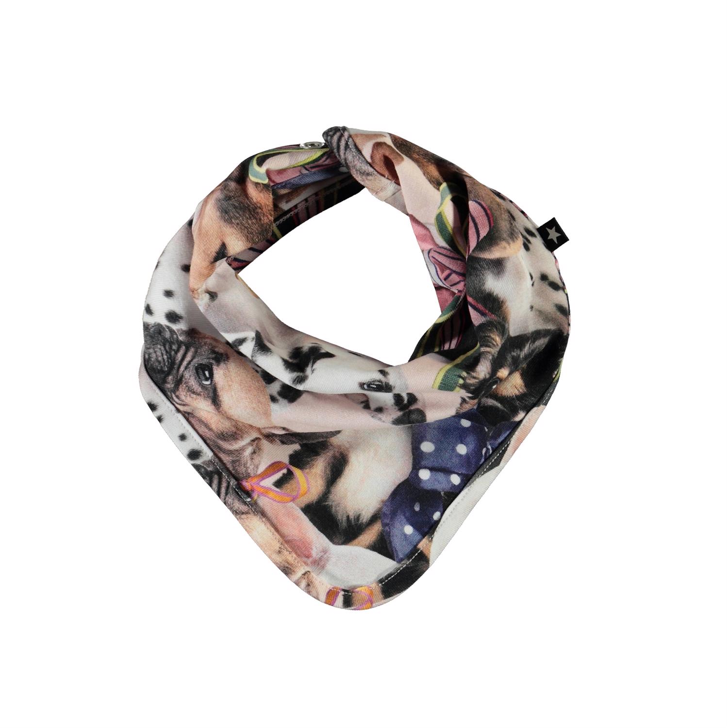Hagesmæk med print af små hunde med sløjfer om halsen. Hagesmækken lukkes med trykknap i nakken. Certificeret af Ecocert Greenlife, certifikationsnr. 197496.