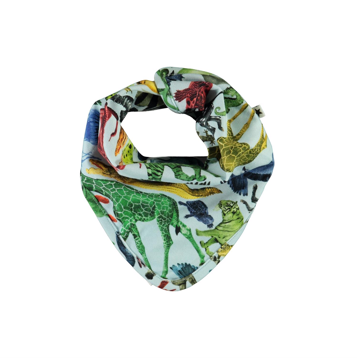 Lyseblå hagesmæk med print af forskellige dyr. Hagesmækken lukkes med trykknap i nakken. Certificeret af Ecocert Greenlife, certifikationsnr. 197496.