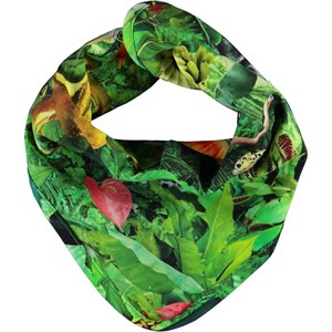 Grøn hagesmæk med print af junglen, som gemmer på forskellige dyr. Hagesmækken lukkes med trykknap i nakken. Certificeret af Ecocert Greenlife, certifikationsnr. 197496.