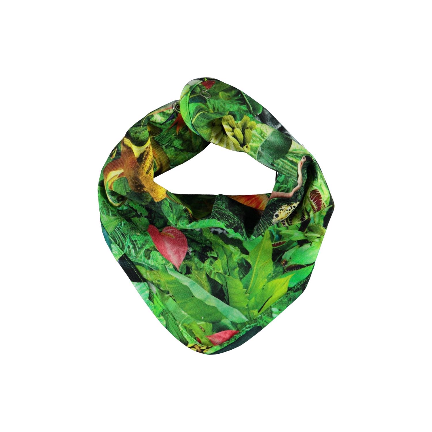 Grøn hagesmæk med print af junglen, som gemmer på forskellige dyr. Hagesmækken lukkes med trykknap i nakken. Certificeret af Ecocert Greenlife, certifikationsnr. 197496.