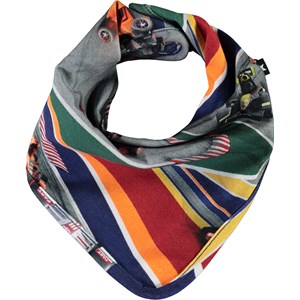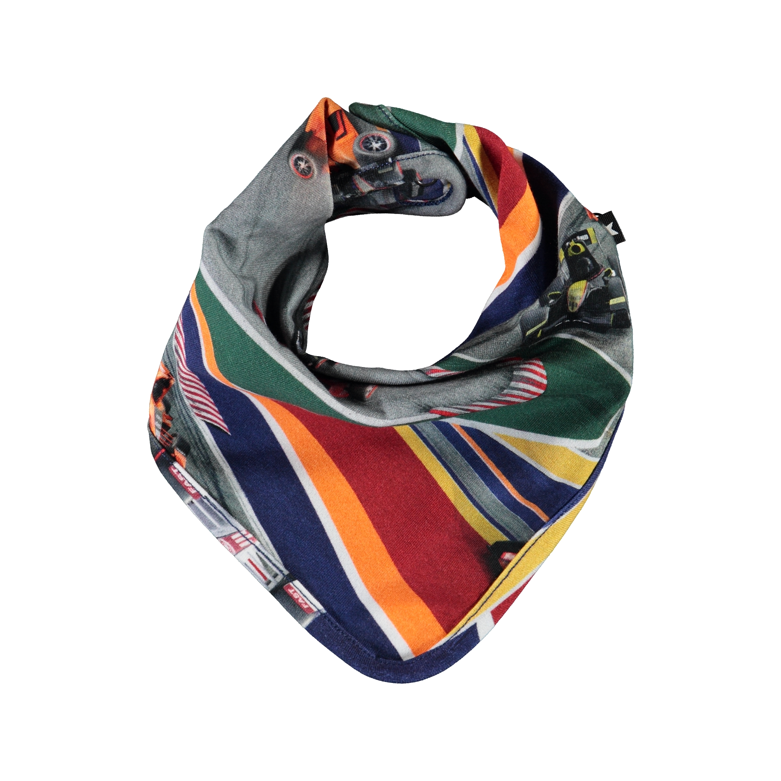 Farverig hagesmæk med print af racerbiler. Hagesmækken lukkes med trykknap i nakken.
