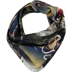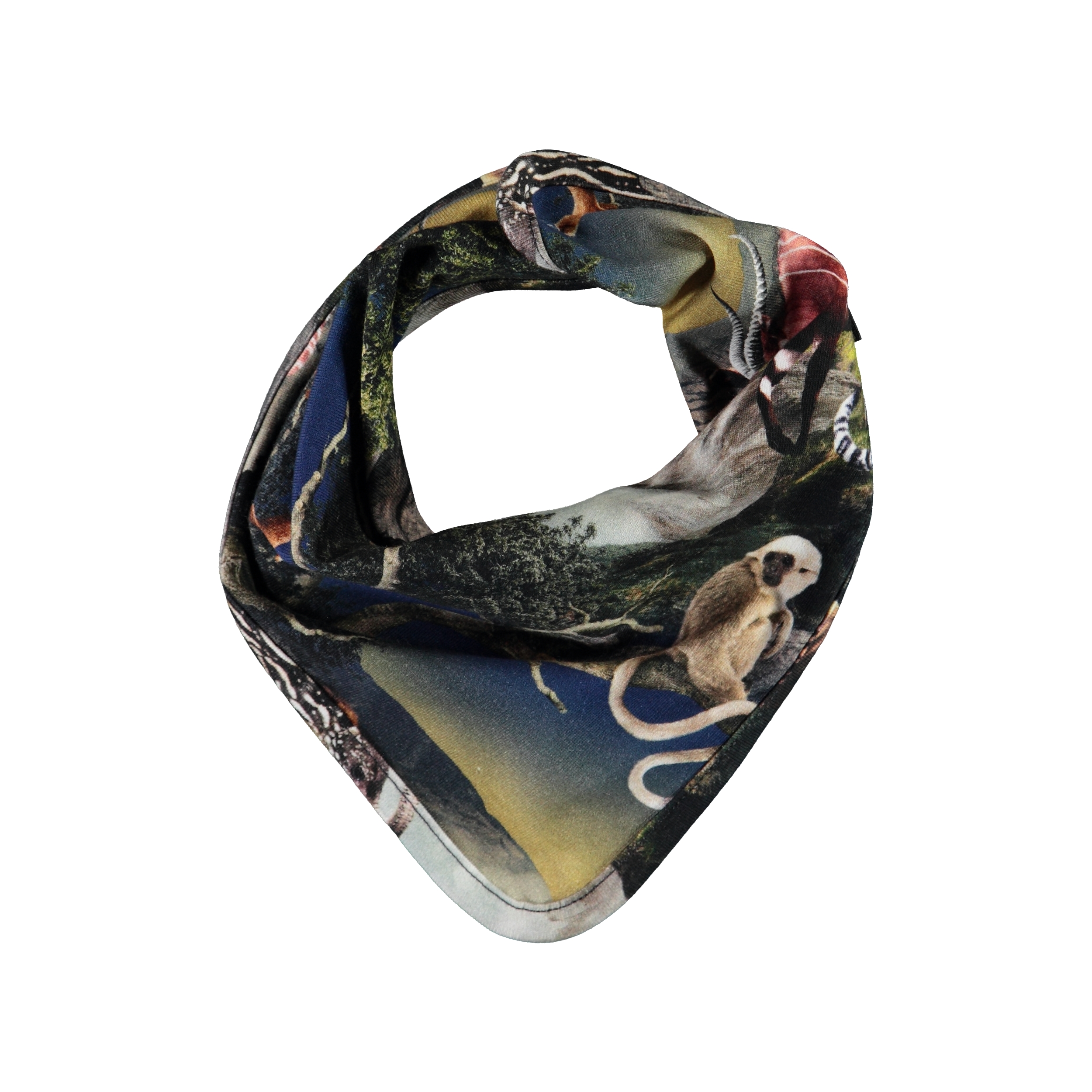 Hagesmæk med print af fremtidens dyr. Hagesmækken lukkes med trykknap i nakken.