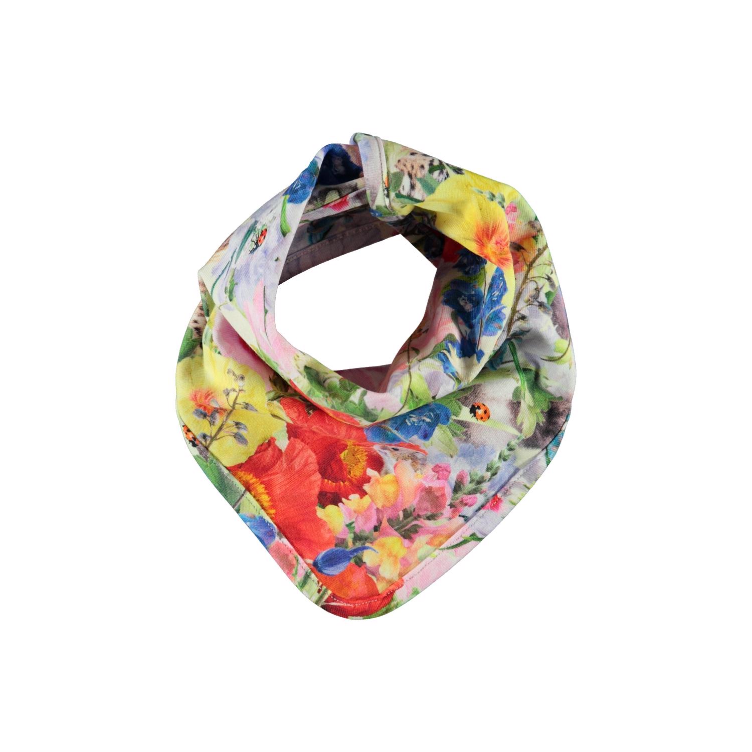 Hagesmæk med print af blomster. Hagesmækken lukkes med trykknap i nakken. Certificeret af Ecocert Greenlife, certifikationsnr. 197496.
