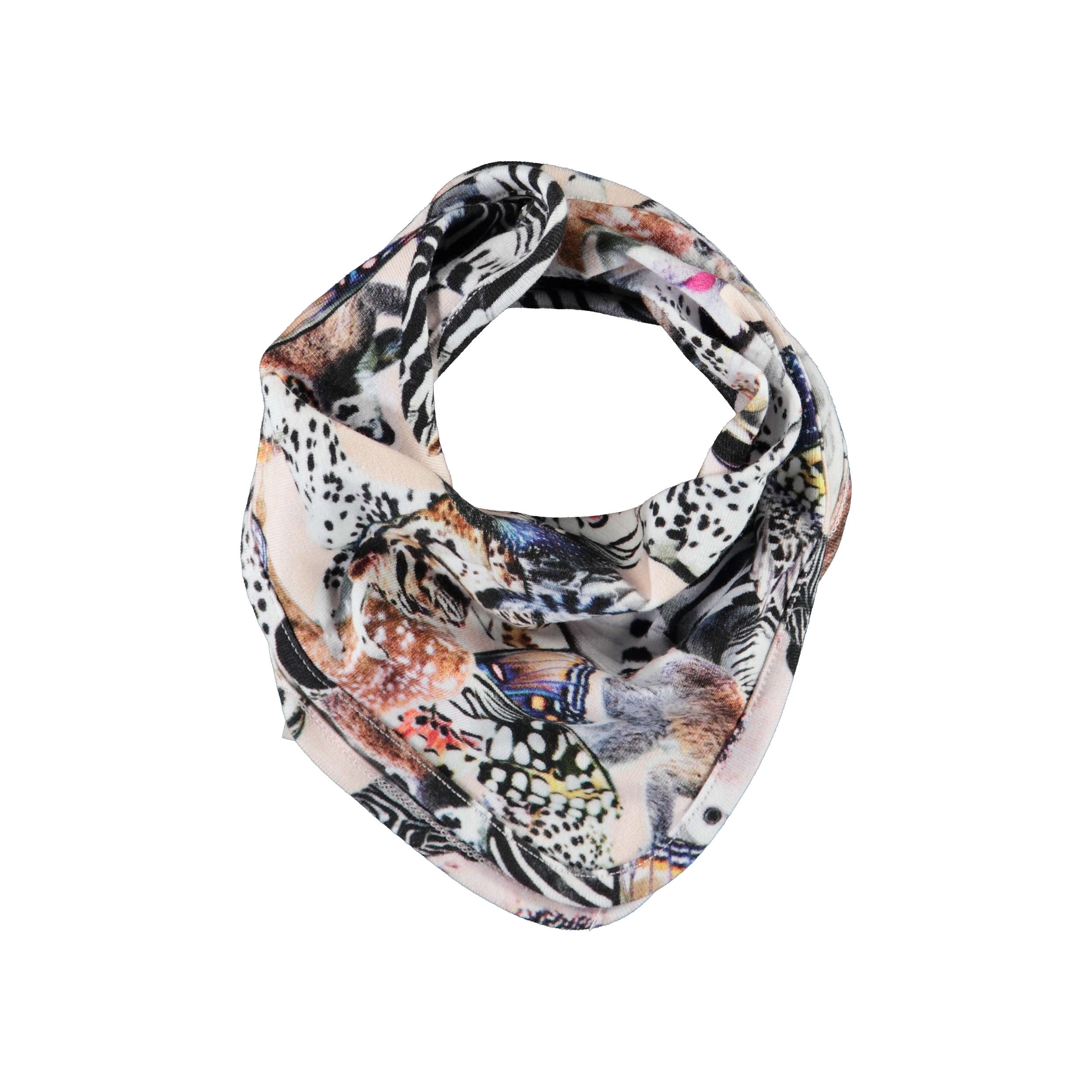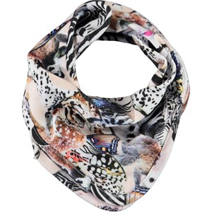 Hagesmæk med print af forskellige dyr, som danner et flot mønster. Hagesmækken lukkes med trykknap i nakken.