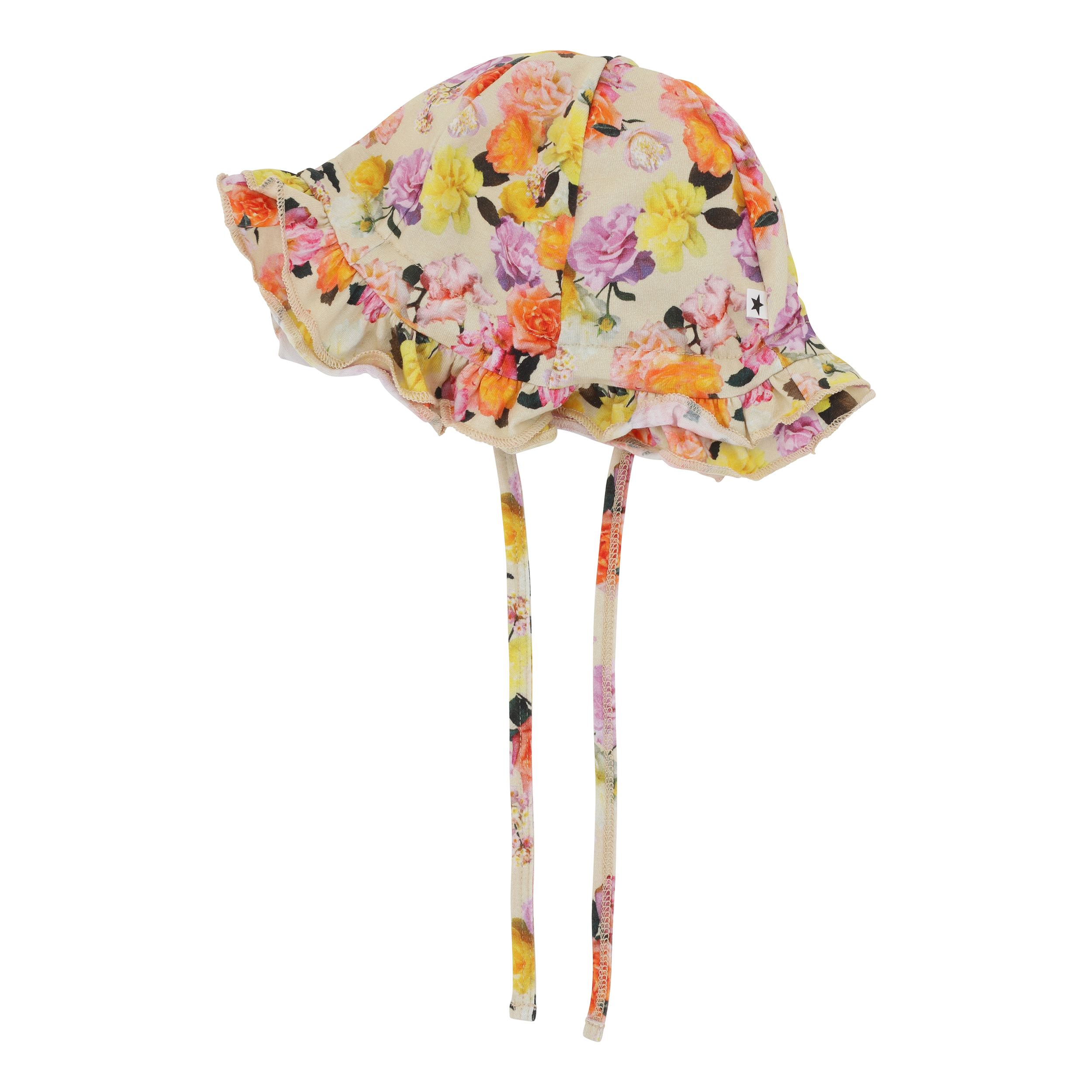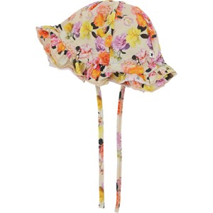 Nizana er en lysegul babyhat med en flæset skygge og et multifarvet roseprint. Hatten har bíndebånd og er fremstillet i 100% økologisk bomuldsjersey.