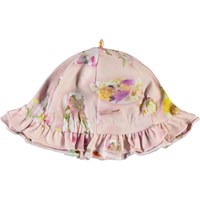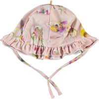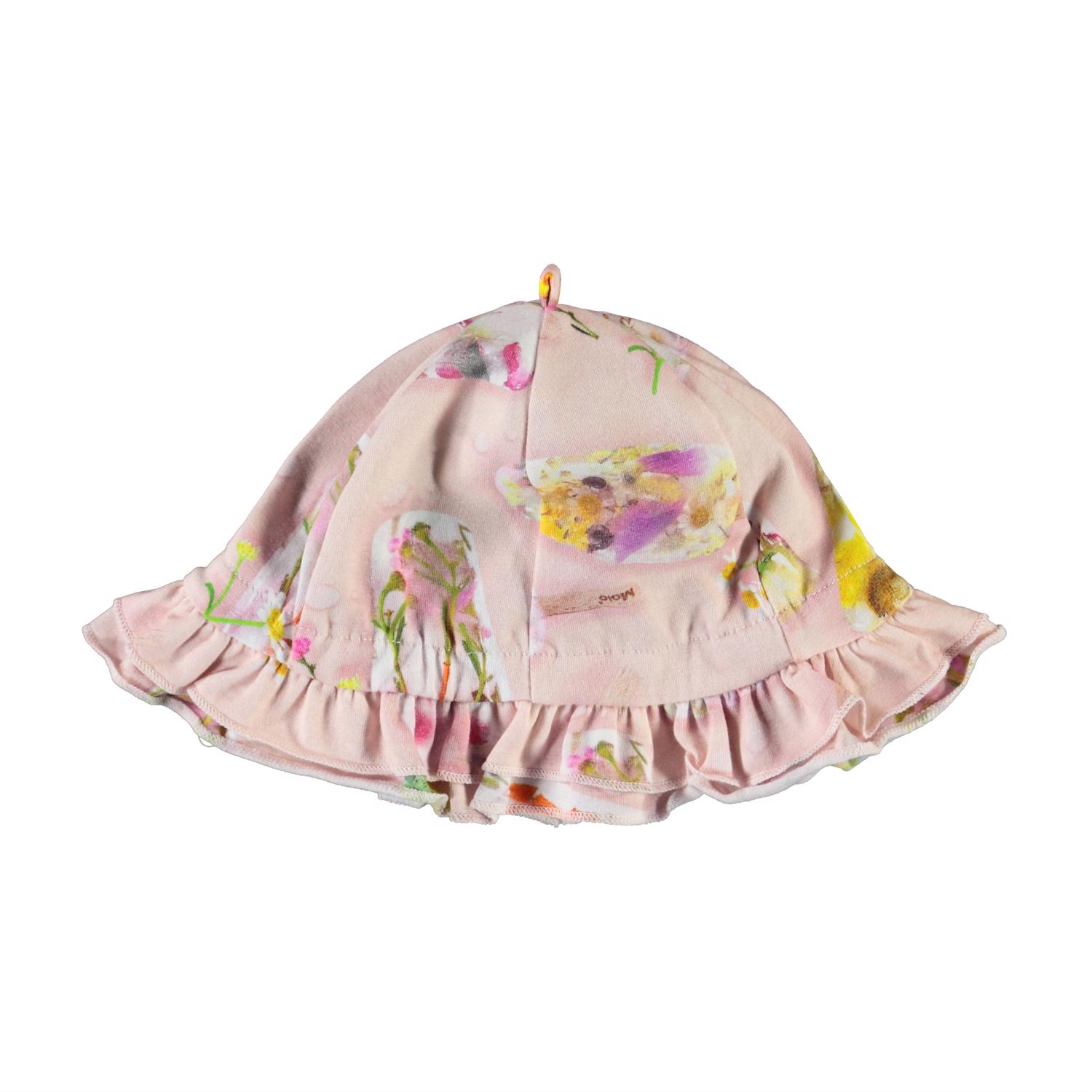 Lyserød baby solhat med is print. Hatten kan bindes tæt til ansigtet med bånd under hagen. Certificeret af Ecocert Greenlife, certifikationsnr. 197496.