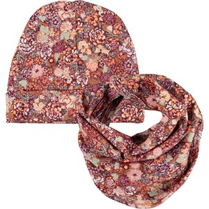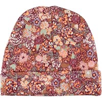 Babyhue og hagesmæk i rødt blomster print. Hagesmækken lukkes med trykknap i nakken.