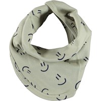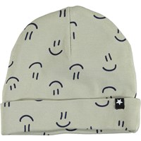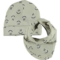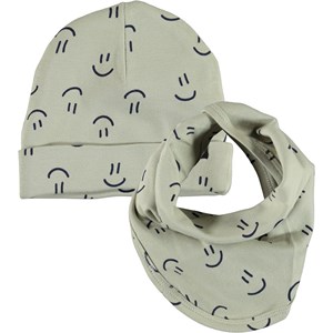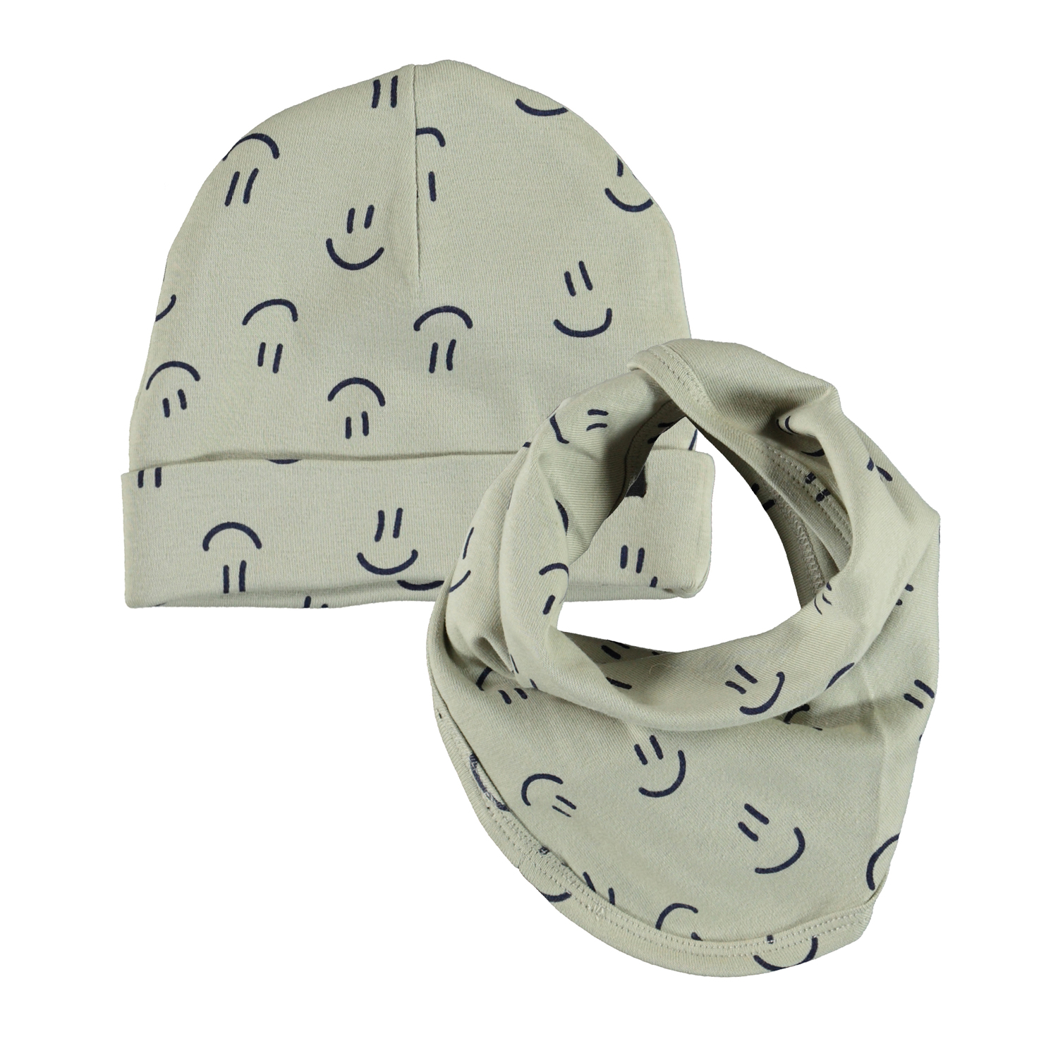 Babyhue og hagesmæk i lysegrå med print af smiley's. Hagesmækken lukkes med trykknap i nakken.