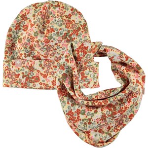 Babyhue og hagesmæk i småblomstret print. Hagesmækken lukkes med trykknap i nakken.