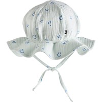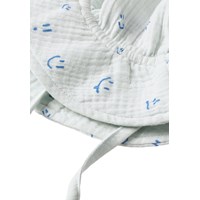 Solhat i lyseblå med happyprint i blød økologisk bomuldsmusselin, til de mindste. Let og luftig med skygge og bindebånd, der holder den på plads.