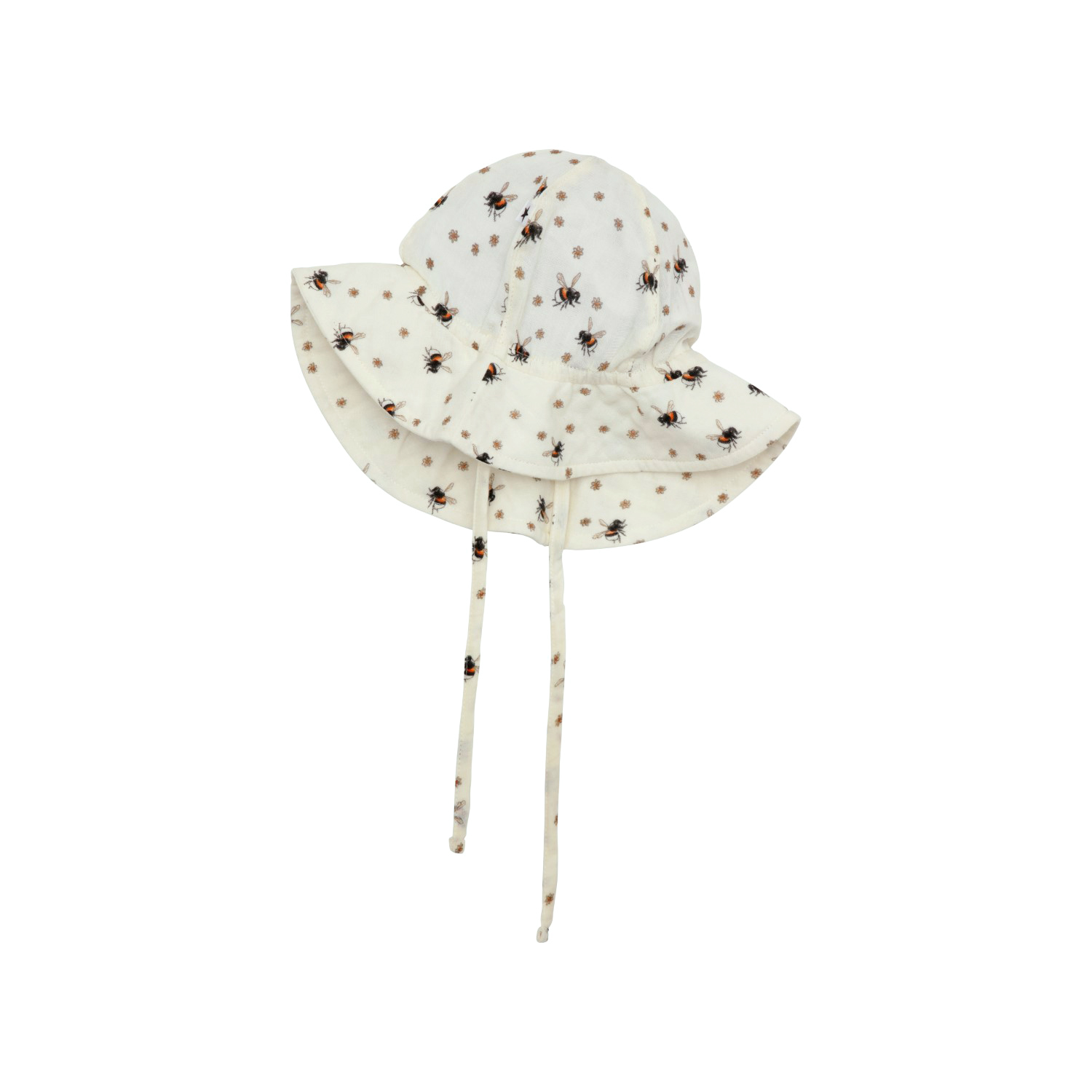 Solhat i let, vævet økologisk bomuld med bølget skygge og bindebånd under hagen. Solhatten har et allover print af små blomster, hvor humlebierne flyver summende omkring.