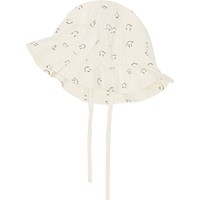 Noel er en hvid babyhat med skygge og bindebånd, fremstillet i 100% bomulds musselin. Hatten er allover printet med små lyseblå, smilende ansigter.