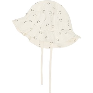 Noel er en hvid babyhat med skygge og bindebånd, fremstillet i 100% bomulds musselin. Hatten er allover printet med små tegnede smil.