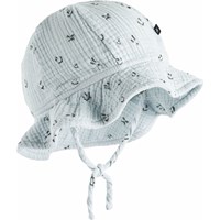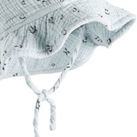 Lyseblå babyhat med skygge og bindebånd, fremstillet i 100% crepet bomuld. Hatten er allover printet med små tegnede smil.