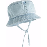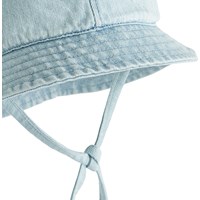 Lyseblå solhat i økologisk bomuldsdenim med bindebånd under hagen i størrelserne 2-12 mdr. og 1-2 år. Størrelse 3-5 år leveres uden bindebånd.