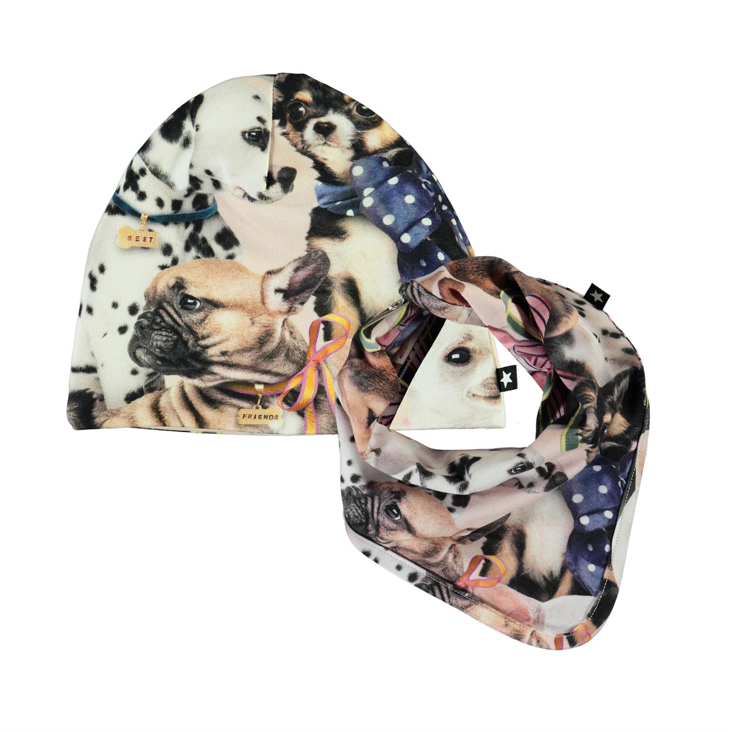 Babyhue og hagesmæk med print af små hunde. Hagesmækken lukkes med trykknap i nakken.