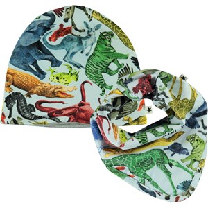 Babyhue og hagesmæk i lyseblå med print af forskellige dyr. Hagesmækken lukkes med trykknap i nakken.