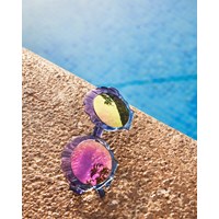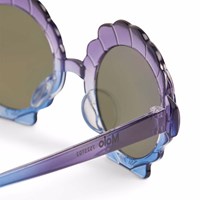 Muslingeformet solbrille i lilla med farvede spejlglas, blank overflade og 100% UV-beskyttelse. Passer til aldersgruppen 7 til 16 år.