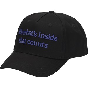 Klassisk baseball kasket i sort med teksten 'It's what's inside that counts'. Kasketten har let bøjet skygge og er regulerbar i nakken. Vejledende størrelsesguide: 3-5 år = 52 cm, 6-8 år = 54 cm, 9-14 år = 56 cm.