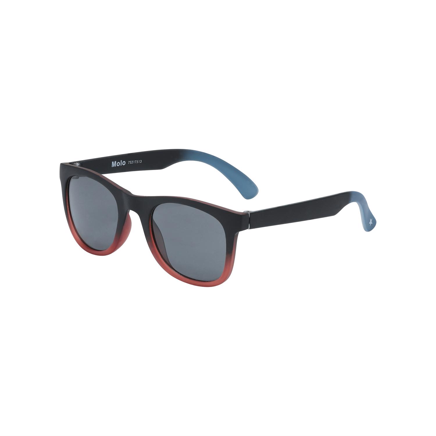 Sorte klassiske solbriller med rød bund og blå for enden af stængerne. Molo's solbriller har 100% UV beskyttelse.