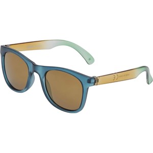 Klassiske blå solbriller med brune glas og brillestænger med bløde striber i brun, hvis og blågrøn. Molo's solbriller har 100% UV beskyttelse.