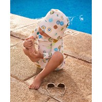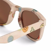 Klassiske solbriller i beige med smilende ansigter, tonede glas, satineret overflade og 100% UV-beskyttelse. Passer til aldersgruppen 7 til 16 år.