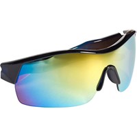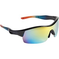 Sporty solbrille i sort, blå og orange med farvede spejlglas og satineret overflade. UV-kategori 3 – blokerer 82-92 % af solens skadelige UV-stråler. Velegnet til solrige dage med behov for effektiv solbeskyttelse. Passer til aldersgruppen 7 til 16 år.