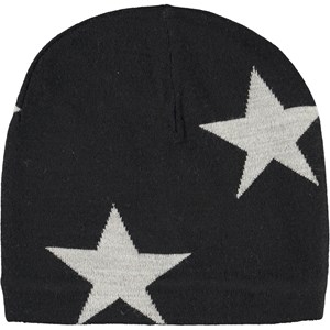 Sort strik hue i en blød uldmix med indstrikkede stjerner og ribkant forneden.