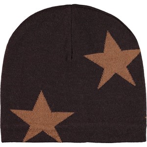 Mørkebrun strik hue i en blød uldmix med indstrikkede stjerner og ribkant forneden.