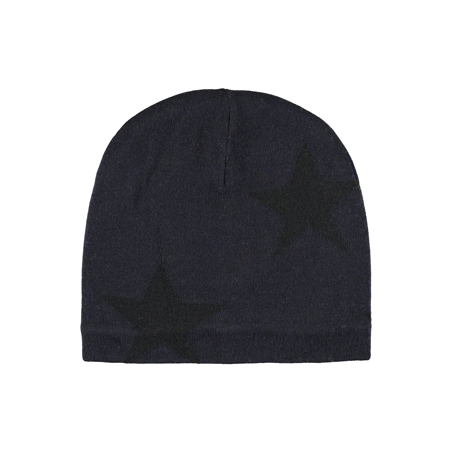 Mørkeblå strik hue i en blød uldmix med indstrikkede stjerner og ribkant forneden.