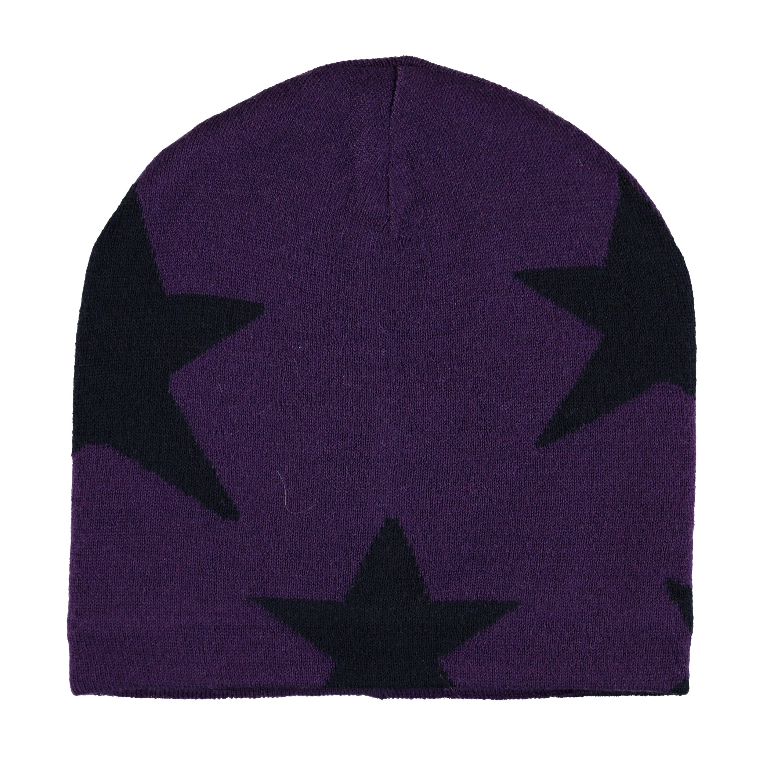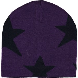 Lilla hue i en blød uldmix med indstrikkede stjerner og ribkant forneden.