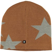 Gylden hue i en blød uldmix med indstrikkede stjerner og ribkant forneden.