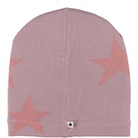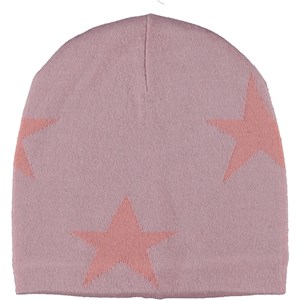 Lyserød strikhue med indstrikkede stjerner. Huen er fremstillet i en blød uldblanding og har ribkant forneden.