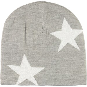Grå strikhue med indstrikkede stjerner. Huen er fremstillet i en blød uldblanding og har ribkant forneden.