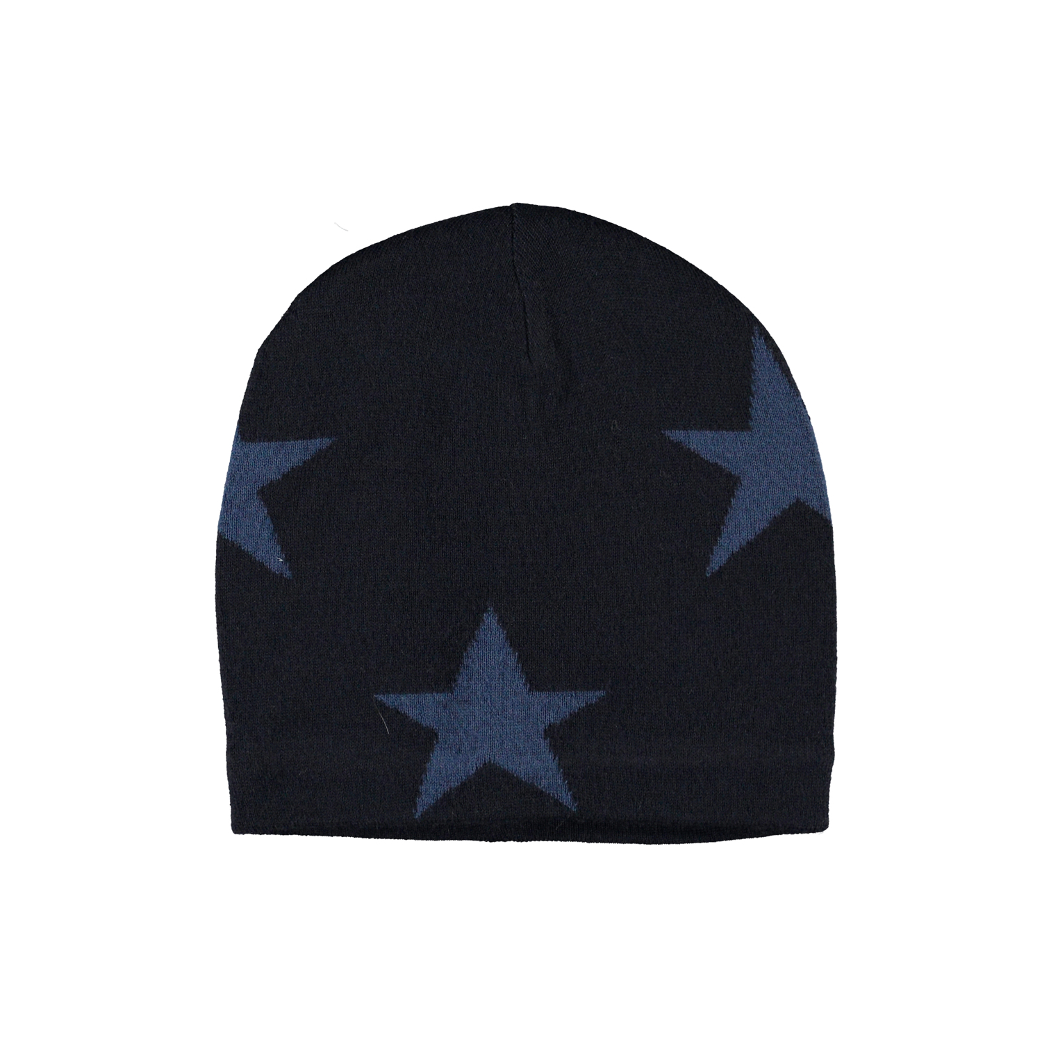 Blå strikhue med indstrikkede stjerner. Huen er fremstillet i en blød uldblanding og har ribkant forneden.