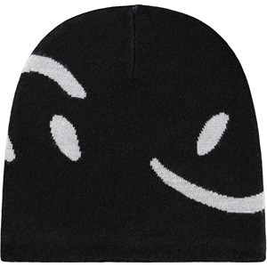 Sort strikhue med råhvid smilende ansigter. Huen er fremstillet i en blød uldblanding.