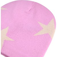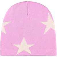 Pink strikhue med cremefarvede stjerner. Huen er fremstillet i en blød uldblanding og har ribkant forneden.