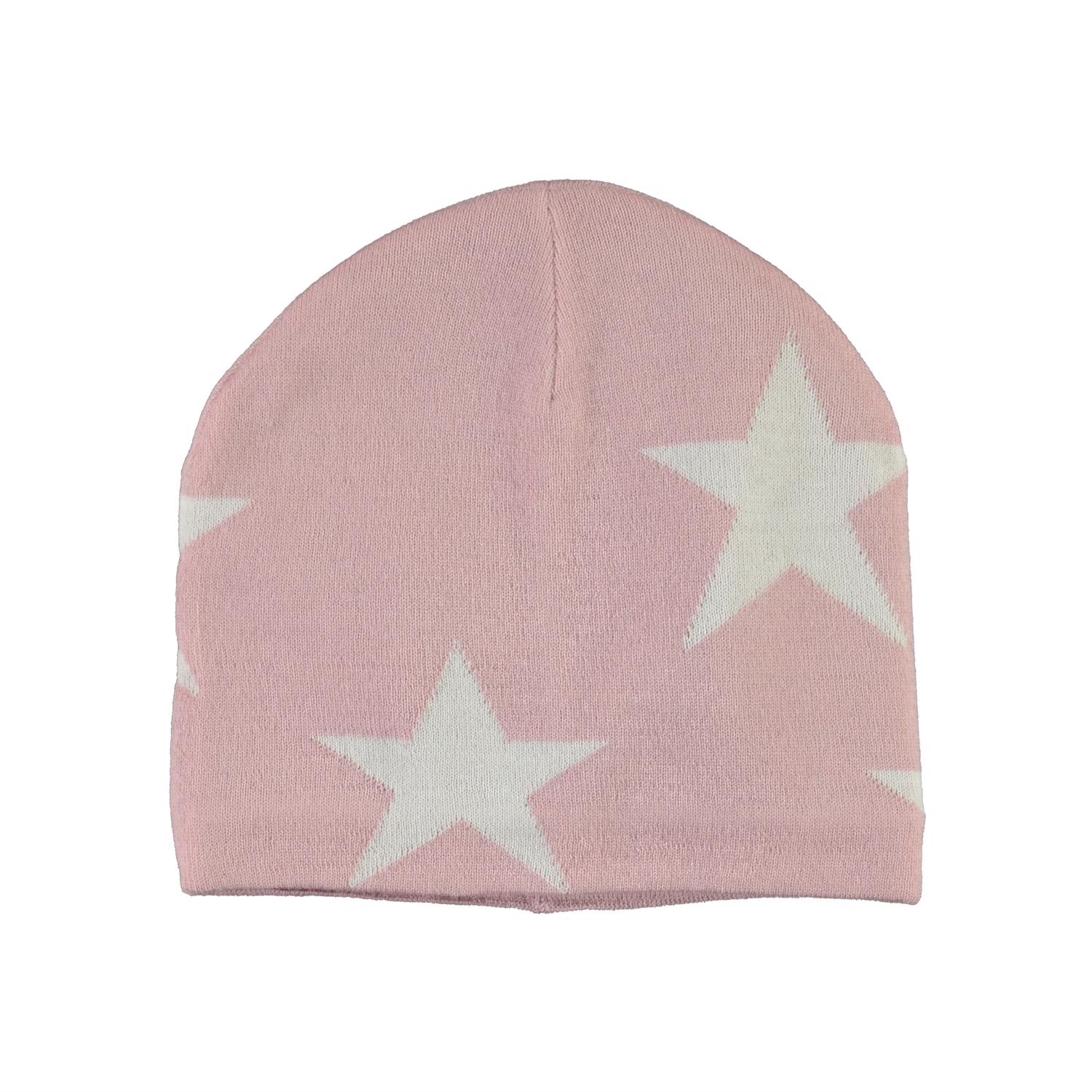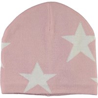 Lyserød hue i en blød uldmix med indstrikkede stjerner og ribkant forneden.